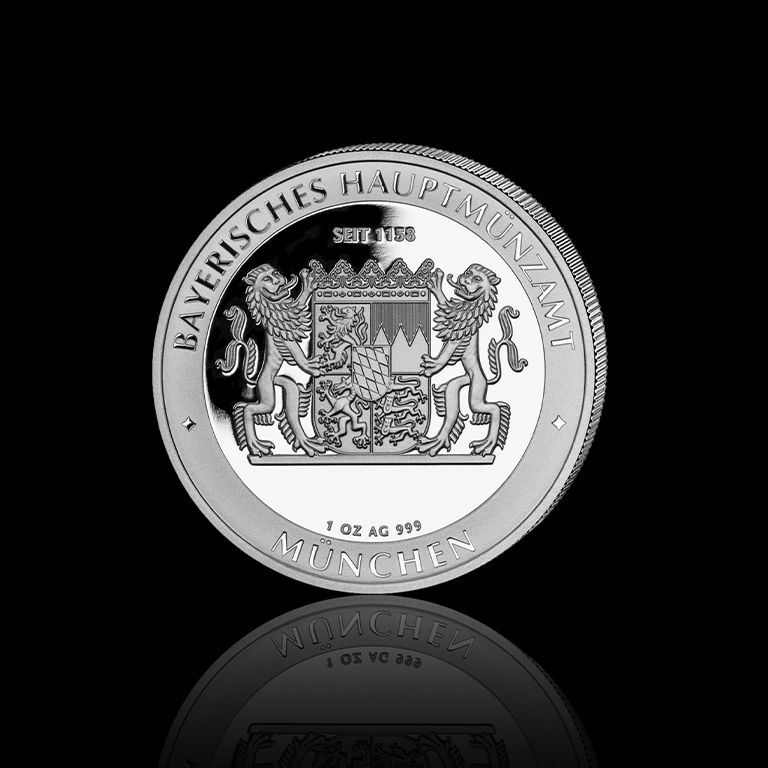 The reverse features the official Coat of Arms of Bavaria, supported by two heraldic lions – emblems of Bavarian power and sovereignty. The central shield is divided into four quarters representing the historic regions of Palatinate, Franconia, Swabia, and Upper Palatinate, with the iconic blue-and-white lozenge shield at its heart – Bavaria’s most recognized symbol. Surrounding the coat of arms is the inscription "SEIT 1158", marking the beginning of coin minting in Munich, along with "Bayerisches Hauptmünzamt – München" and the technical details "1 oz Silver .999".